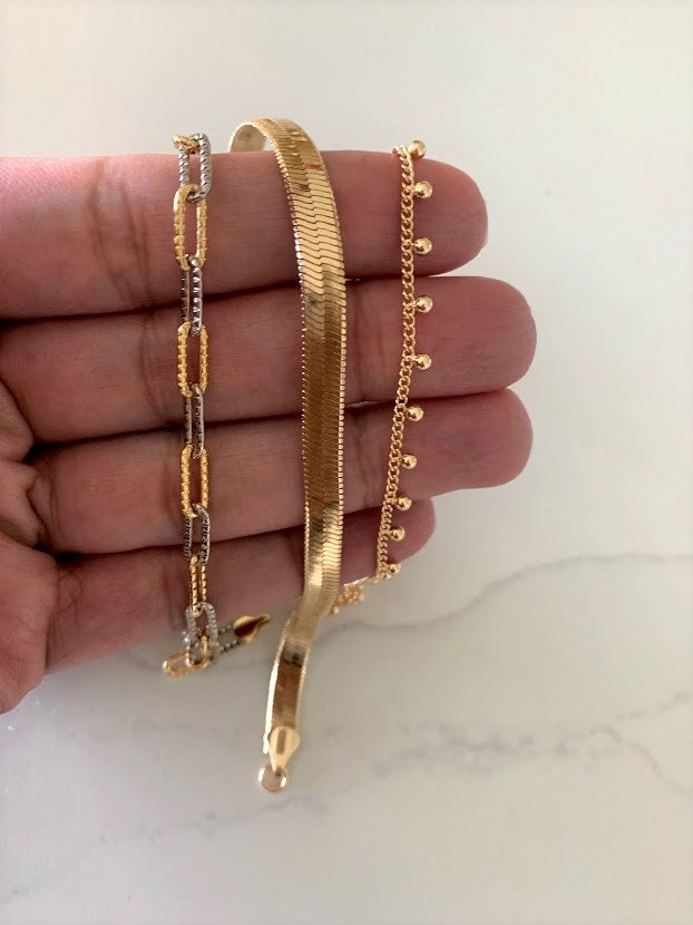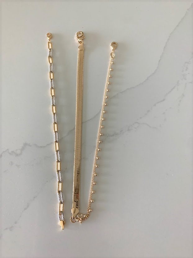 18K Gold Filled Bracelet Trio: Paperclip, Herringbone, Beaded