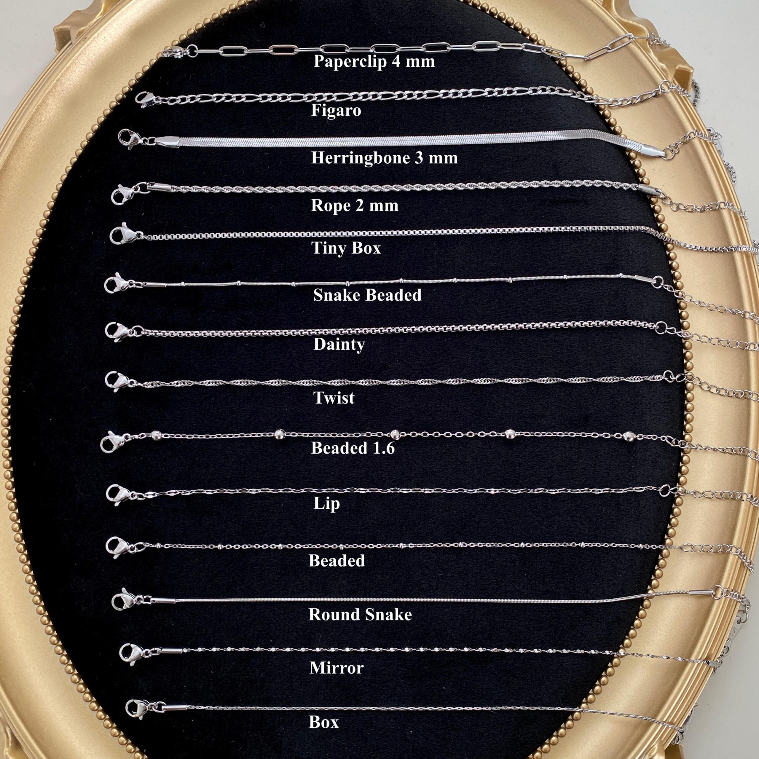 | Style | Paperclip 2mm, Paperclip 3mm, Paperclip 4mm, Rope2mm(Silver Only), Rope 3mm, Rope4mm(Silver Only), Beaded 1.2mm, Beaded 1.6mm, Dainty 2mm, Herringbone 2 mm, Herringbone 3 mm, Herringbone-4 Silver, Twist 2mm, Snake Beaded 0.9mm, Round Snake 0.9mm, Lip 2mm, Box 0.8mm, Figaro, Tiny Box, Mirror(Silver Only) |