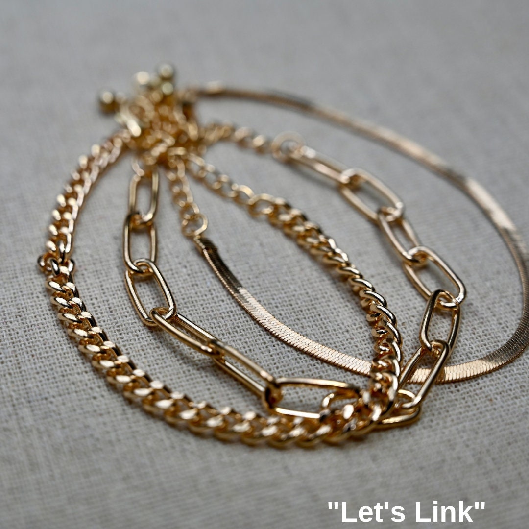 The “Let's Link” Trio features a classic herringbone, Cuban link, and paper clip chain style.