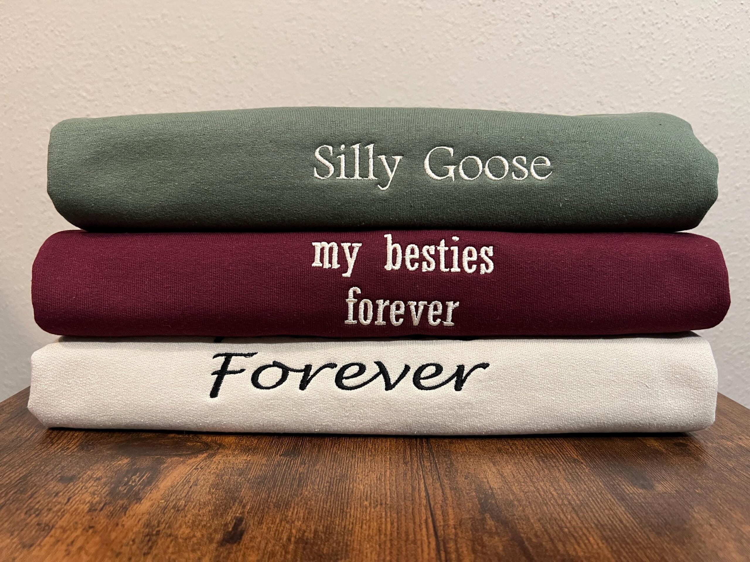 Our advanced embroidery machine brings your text to life, creating a one-of-a-kind keepsake you’ll treasure for years. Design your custom embroidered sweatshirts today and express your personal style in a way that’s truly your own.