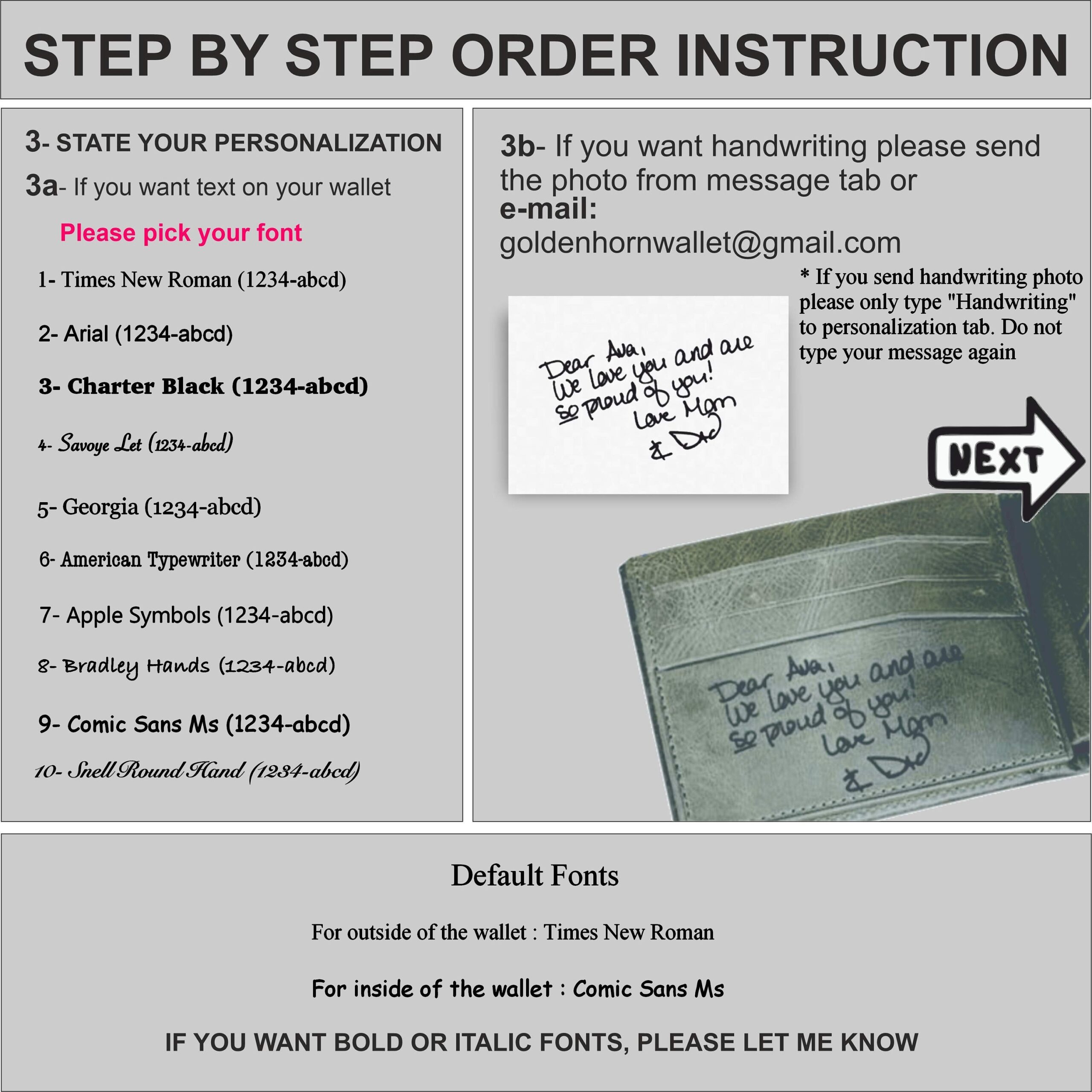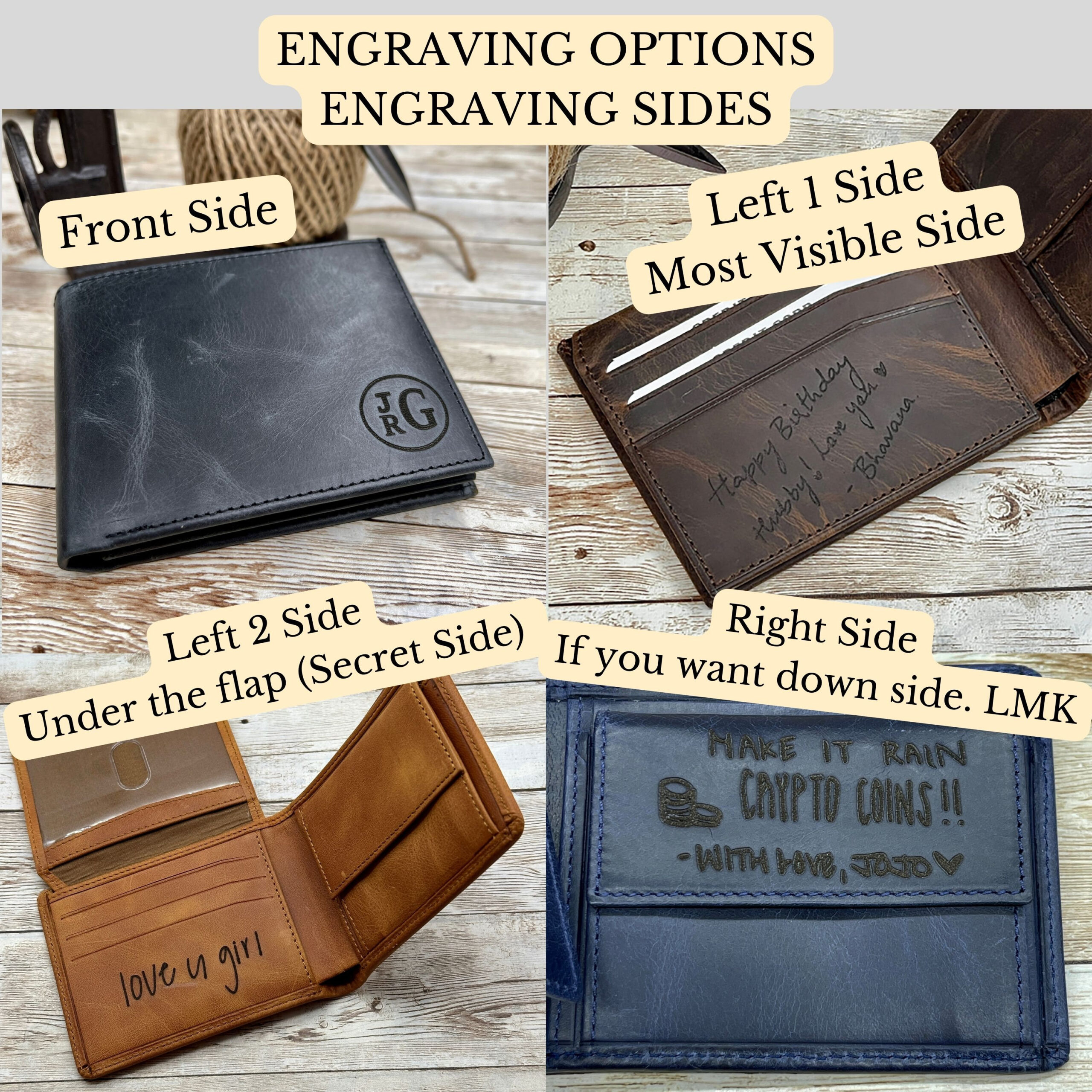 * If you want your handwriting or photo engraving, please send it on ETSY Message or email to goldenhornwallet@gmail.com