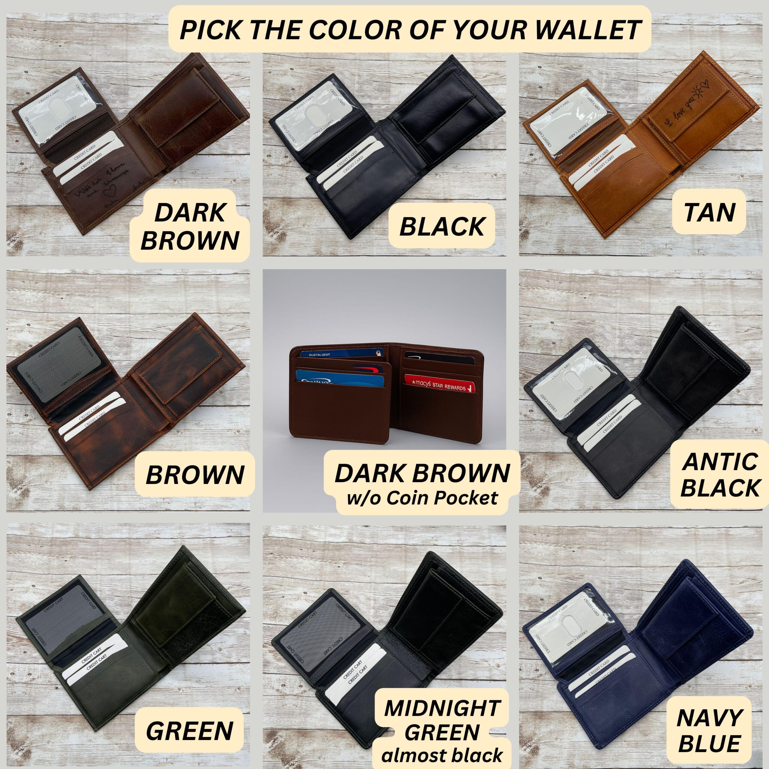 | Color and Style of the Wallet | Dark Brown, D Bro w/o Coin Pockt, Brown, Tan, Tan w/o Coin Pocket, Black, Antic Black, Navy Blue, Green, Midnight Green, Bi-fold Black, Bi-Fold Tan, Bi-Fold Dark Brown, Bi-Fold Navy Blue, Bi-Fold Green, Card Holder-Black, Card Holder-D.Brown, Card Holder-Tan, Card Holder-Red |